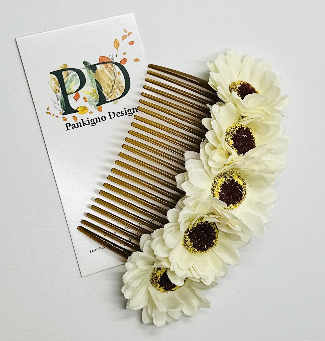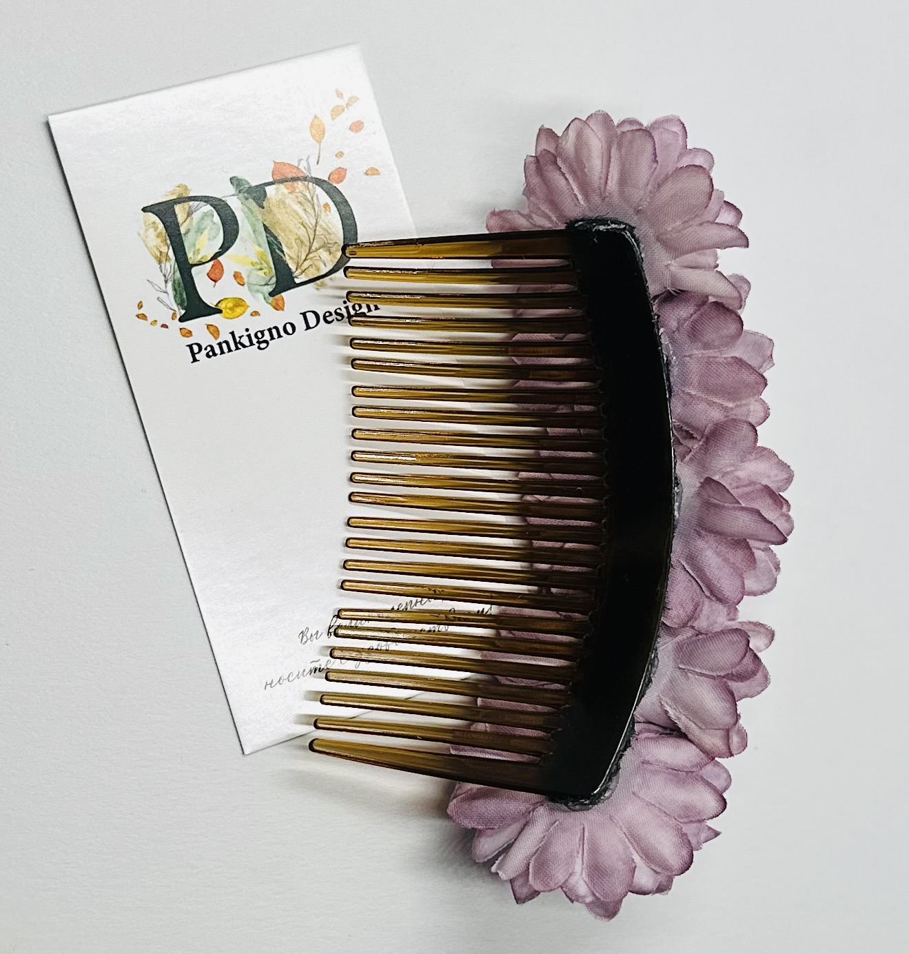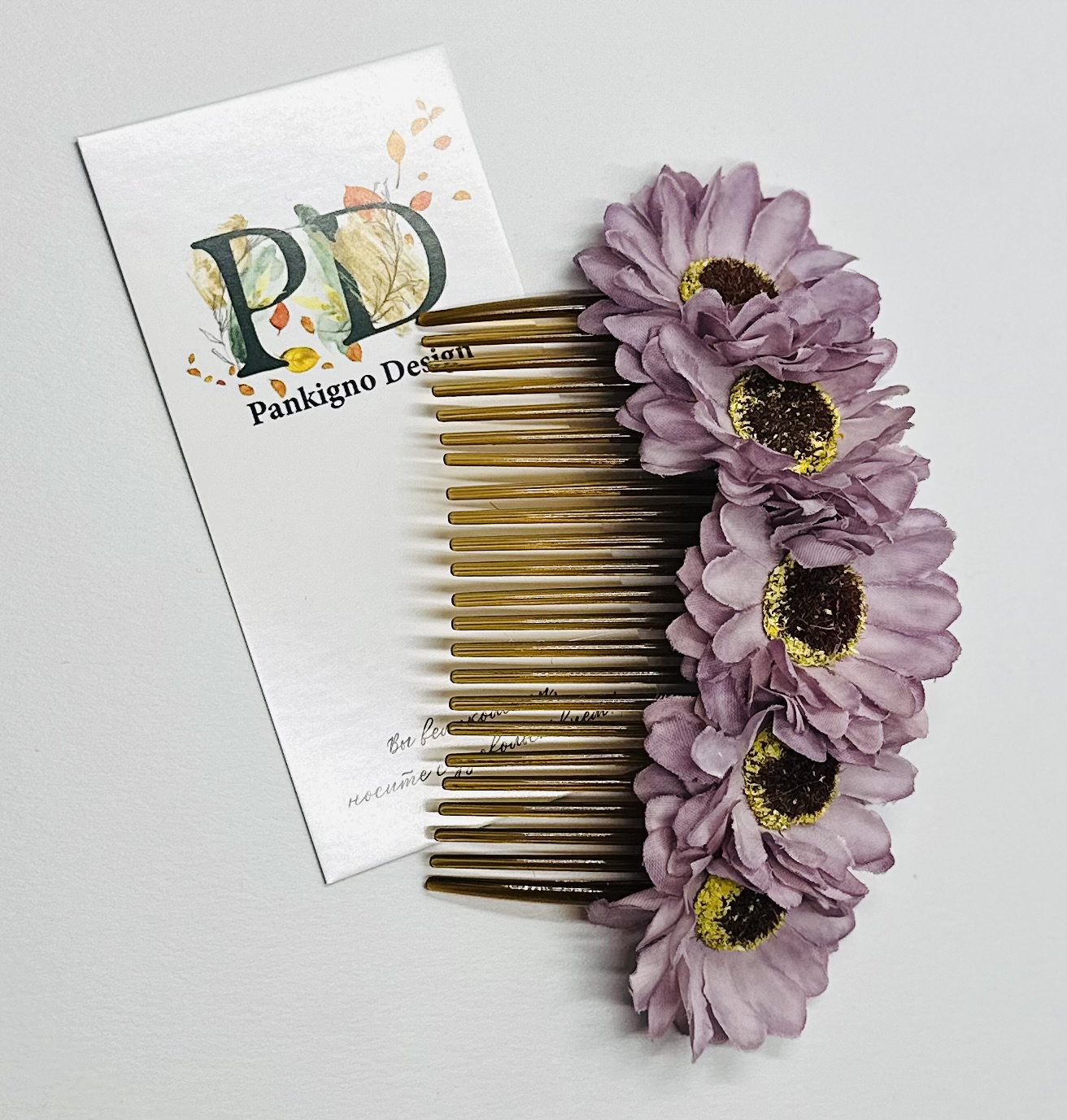 Гребень Pankigno Design с изящным цветками хризантемы подчеркнет вашу индивидуальность и станет стильным аксессуаром для любого образа. Ручная работа гарантирует уникальность изделия и высокое качество исполнения. Легкий вес (всего 20 г) обеспечивает комфортное ношение без ощущения тяжести. Идеален как повседневный элемент причёски, так и для особых случаев – свадебных церемоний, фотосессий или вечеринок. Добавьте нотку элегантности вашим образам вместе с этим изысканным гребнем!