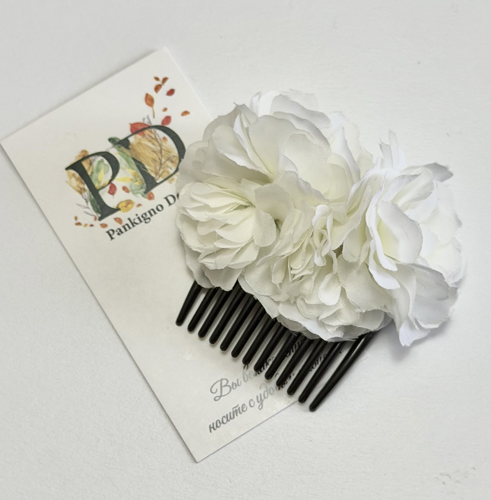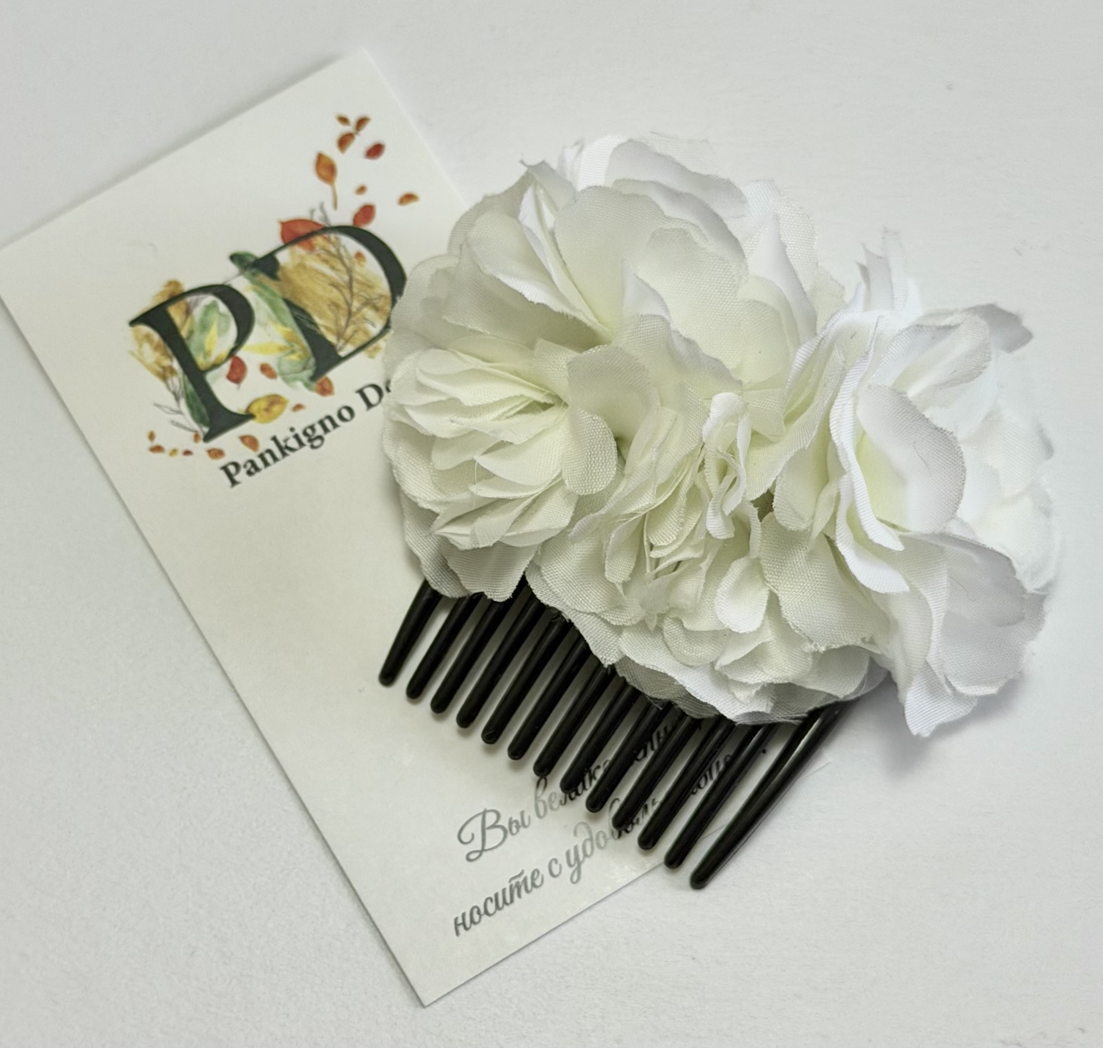 Новинка 2026 года – элегантные мини-гребни Pankigno Design с изящными белыми цветочными элементами из высококачественных материалов ручного изготовления. Легкие (всего 45 г), они идеально подходят как аксессуар к прическам, добавляя нотку утонченности и стиля. Ваш безупречный вид гарантирован!